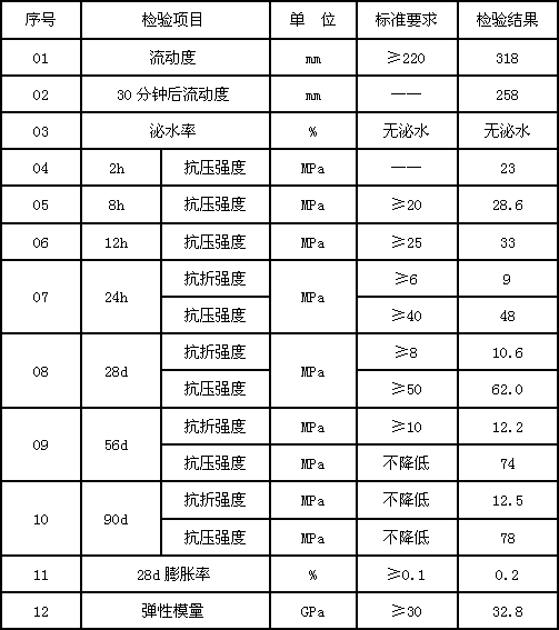 其性能指標(biāo)符合《京滬高速鐵路高性能混凝土施實(shí)施細(xì)則》與《客運(yùn)專線橋梁盆式橡膠支座暫行技術(shù)條件》等國家與鐵路行業(yè)標(biāo)準(zhǔn)技術(shù)要求。具有優(yōu)異的流動性,自流找平,不需振搗,抹壓,施工速度快、方便;具有非常高的小時強(qiáng)度、后期強(qiáng)度高,不收縮;根據(jù)不同的施工溫度,2小時即可獲得20-40Mpa的抗壓強(qiáng)度,抗折強(qiáng)度高;具有微膨脹性能及優(yōu)異的抗開裂性能;適應(yīng)溫度范圍寬,在-5℃~-35℃條件下,無需任何輔助保溫或降溫措施都可施工;在高溫或低溫條件下,能夠同時保證強(qiáng)度發(fā)展和施工流動性的需要。